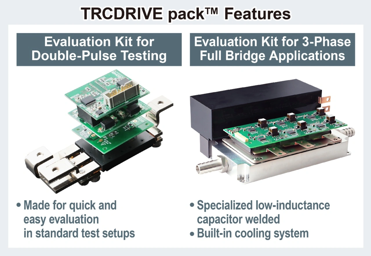 ROHM bietet umfangreiche Unterstützung auf Anwendungsebene, einschließlich der Nutzung des hauseigenen Motorprüf-Equipments. Darüber hinaus stellt das Unternehmen eine Vielzahl von Hilfsmaterialien zur Verfügung, zum Beispiel Simulationen und thermische Designs, die eine schnelle Bewertung und Einführung von TRCDRIVE pack™-Produkten ermöglichen. Es sind auch zwei Evaluierungskits erhältlich, eines für Doppelpulstests und das andere für 3-Phasen-Vollbrückenanwendungen, die eine Evaluierung unter ähnlichen Bedingungen wie bei praktischen Wechselrichterschaltungen ermöglichen.