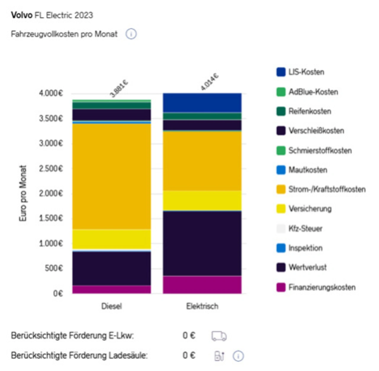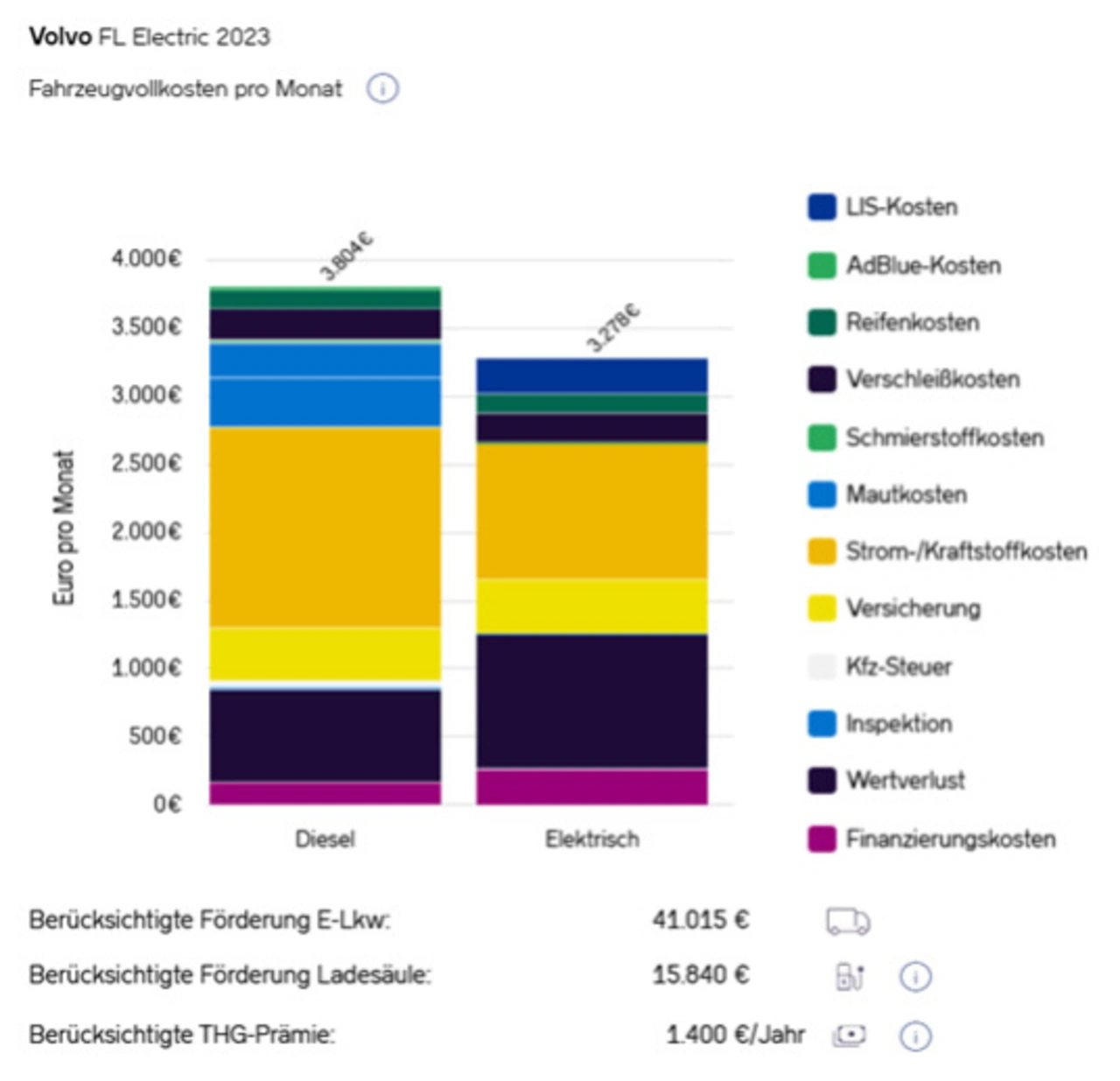 Das Ergebnis: Der gewählte E-Lkw ist im Vergleich mit einem gleichwertigen Diesel-Lkw die günstigere Lösung in Bezug auf die Fahrzeugvollkosten pro Monat. Keine Berücksichtigung findet der Zusatznutzen einer eigenen PV-Anlage mit oder ohne Speicher.