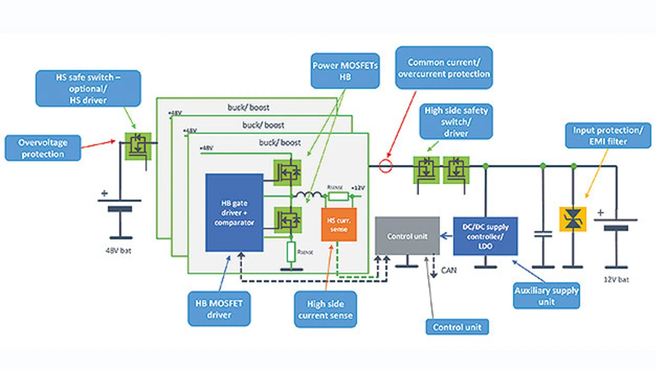 In die Verbindung zur 48-V-Batterie ist ein Sicherheitsschalter eingefügt, um das System im Störungsfall elektrisch trennen zu können. Dieser Schalter wird üblicherweise aus parallelgeschalteten 80-V-MOSFETs mit groß dimensionierten Chips, einem niedrigen statischen Drain-Source-Widerstand (RDS(on)) und hoher Stromfestigkeit gebildet. Der als Power-Modul konstruierte Gleichspannungswandler besteht aus einem Halbbrücken-Treiber mit eingebautem Komparator zur Stromerfassung, der aus Leistungs-MOSFETs gebildeten Halbbrücke (HB) sowie einer Steuereinheit zum Synchronisieren, Aktivieren und Regeln der Interaktion und Aktivierung der einzelnen Phasen gemäß dem jeweiligen Belastungszustand. Zusätzlich übernimmt die Steuerung das Abschalten des Systems, falls es zu gefährlichen Übergangszuständen kommt.