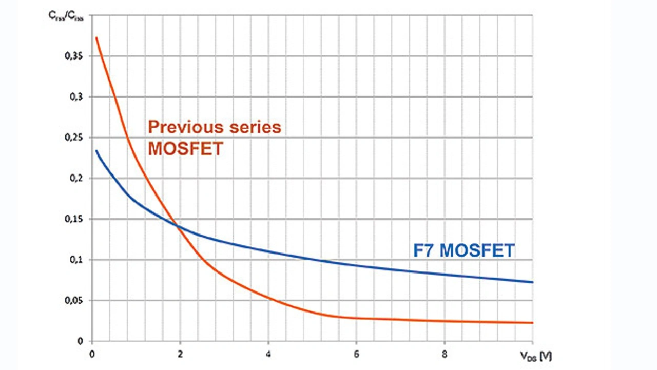 Für 80 V bis 100 V ausgelegte Automotive-Leistungs-MOSFETs auf Basis der STPOWER-STripFET-F7-Technologie wurden gegenüber den Bausteinen der vorigen Serie bezüglich ihrer Anfälligkeit für den Miller-Effekt und ihres Kapazitätsverhältnisses Crss/Ciss optimiert (Bild 2).
