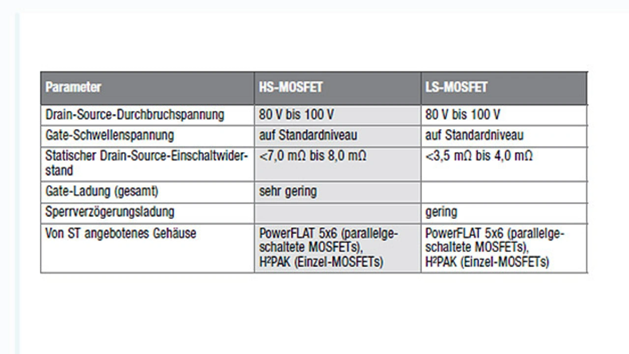 Die grundlegenden Kriterien zum Auswählen der richtigen MOSFETs für einen von 48 V auf 12 V wandelnden Gleichspannungswandler gehen aus Tabelle 1 hervor. Den besten Kompromiss zwischen Minimierung der Schaltverluste und Optimierung der Leitungsverluste erhält man, wenn man als LS-MOSFET einen Baustein mit niedrigem statischem RDS(on) einsetzt, während als HS-MOSFET ein Bauelement mit geringer Gate-Drain-Ladung (Qgd) zum Einsatz kommt. Diese Abwägung hat großen Einfluss auf den Wirkungsgrad des Systems [3].
