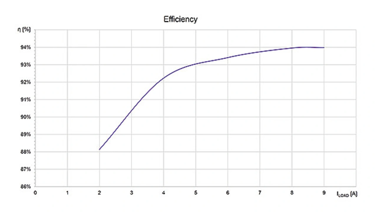Prototypen von Automotive-MOSFETs mit Nennspannungen von 80 V bis 100 V, die mit der neuen Technologie hergestellt wurden, legen ein klassenbestes Schaltverhalten an den Tag, mit sanften Spitzen von VDS und sehr kurzen Oszillationsphasen. Mit den neuen MOSFETs erreicht der Gleichspannungswandler einen gemessenen Wirkungsgrad von 94 %, wie in Bild 3 erkennbar ist.