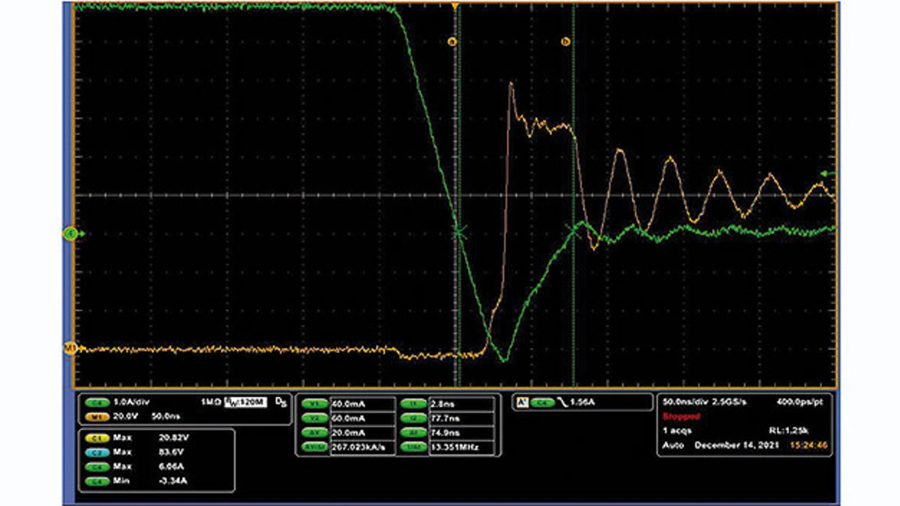 Der Wirkungsgrad des Wandlers wird ebenfalls von der Sperrverzögerungsladung der Body-Drain-Diode des LS-MOSFET beeinflusst. Die neue technologische Weiterentwicklung sorgt auch hier für signifikante Verbesserungen, und zwar selbst dann, wenn der in die Body-Diode fließende Sperrerholstrom steile Flanken (das heißt hohe di/dt-Werte) aufweist. Siehe dazu die in Bild 4 gezeigten Signalverläufe.