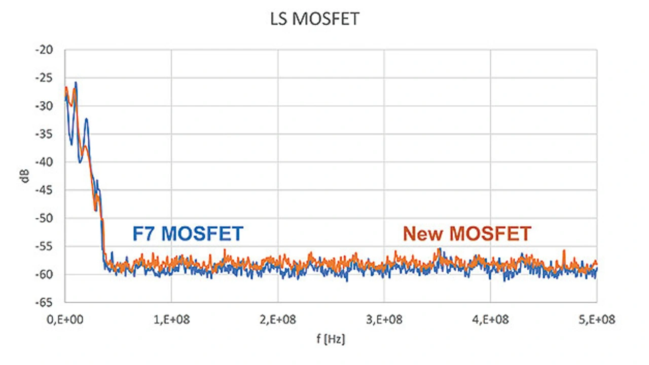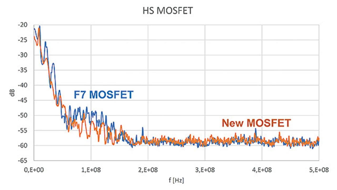 Dieser Sperrerholstrom hat außerdem erheblichen Einfluss auf das Emissionsverhalten des Wandlers, denn wegen der beim Abklingen des Stroms auf Null auftretenden Oszillationen ist er die Hauptursache hochfrequenter Störaussendungen [4]. Nahfeld-Emissionsmessungen geben die EMI-Beständigkeit der neuen MOSFET-Prototypen wieder und vergleichen das Emissionsaufkommen mit Bausteinen der Reihe STripFET F7. Das experimentell ermittelte Emissionsspektrum des LS- und des HS-MOSFET in einer Halbbrückentopologie geht aus den Bildern 5 und 6 hervor. Die Bausteine schalten dabei einen Strom von etwa 15 A [5].