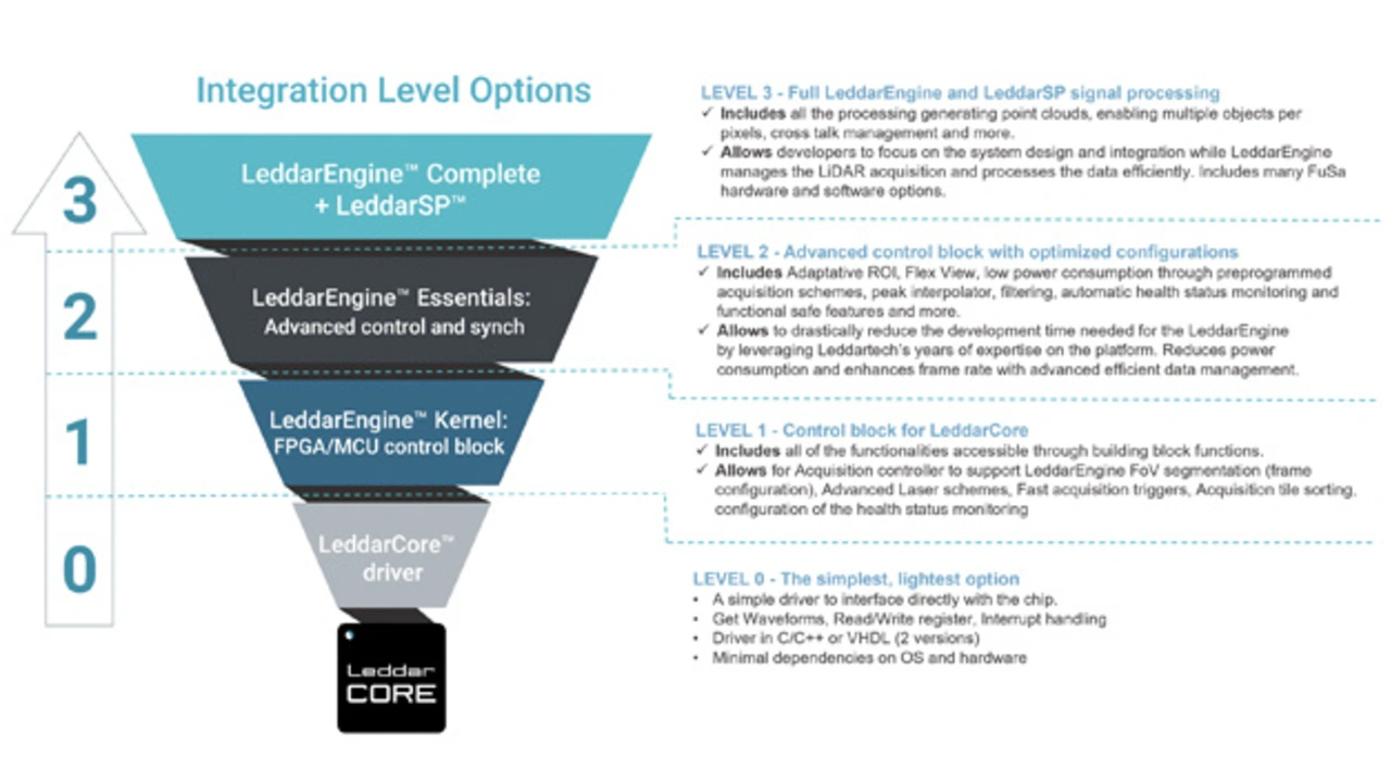 Die LeddarEngine stellt ein »Pick-what-you-need»-Angebot dar. Sie ermöglicht es Lidar-Entwicklern, die Komponenten zu nutzen, die sie brauchen. Es steht eine Reihe von Optionen zur Verfügung, angefangen bei der Basisversion für Level 0, die aus einem Chip und einem einfachen Treiber zur Durchführung von