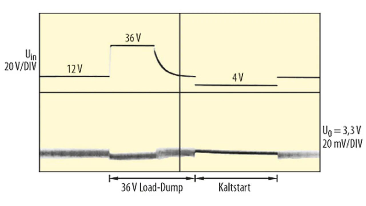 Bei Verwendung von zwei Bleibatterien in Reihe steigt die nominale Batteriespannung auf 24 V und benötigt einen Schutz vor Spannungsspitzen bis zu 60 V bei Überlast (Load Dump), verglichen mit einer nominalen Batteriespannung von 12 V bei Fahrzeugen und Schutzfunktionen für Spannungsspitzen von bis zu 36 V bei einer Überlastung. Umgekehrt benötigen Automobilapplikationen mit einer Batterie Leistungs-ICs, die mit Eingangsspannungen bis hinunter zu 3,5 V arbeiten, um mit den niedrigen Spannungen zurechtzukommen, die bei Kaltstart- und Start/Stopp-Bedingungen vorkommen. In Applikationen mit zwei Batterien sind diese Anforderungen in Hinsicht auf niedrige Eingangsspannungen nicht so streng, weil hier nur minimal 7 V Batteriespannung auftreten. Die großen temporären Spannungsschwankungen während Kaltstart/Start-Stopp und Überlast für Anwendungen mit einer Bleibatterie verdeutlicht Bild 1. Anwendungen mit zwei Batterien sehen ähnlich aus, aber die maximale Spannung während Load Dump beträgt generell 60 V und das Minimum während Kaltstart/Start-Stopp liegt bei 7 V.
