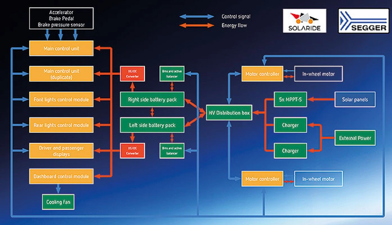 Als Solaride mit dem Bau seines ersten Solarautos begann, berücksichtigte man von Anfang an Software von Segger. Die Ingenieure von Solaride entschieden sich für embOS, Seggers embedded Echtzeit-Betriebssystem, und emWin, die embedded GUI-Bibliothek, um eine Benutzeroberfläche auf den Bildschirmen des Autos zu erstellen. Solaride verwendet emWin, um dem Fahrer und dem Copiloten des Fahrzeugs Daten an- zuzeigen. embOS wird im Hauptsteuergerät, dem »Gehirn« des Fahrzeugs, und anderen Steuergeräten verwendet. Bild 1 zeigt ein Blockdiagramm der Embedded-Architektur des Fahrzeugs.