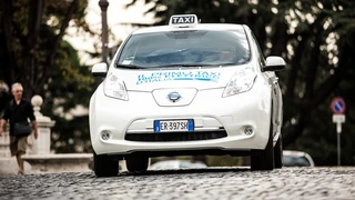 Nissan und die italienische Taxifahrervereinigung URI testen zwei Leaf als Elektro-Taxi in Rom. Beide Fahrzeuge lassen sich an einer fest installierten Chademo-Schnell-Ladestation am Flughafen Fiumicino, aber auch an einem mobilen »Quick-Charger« aufladen.