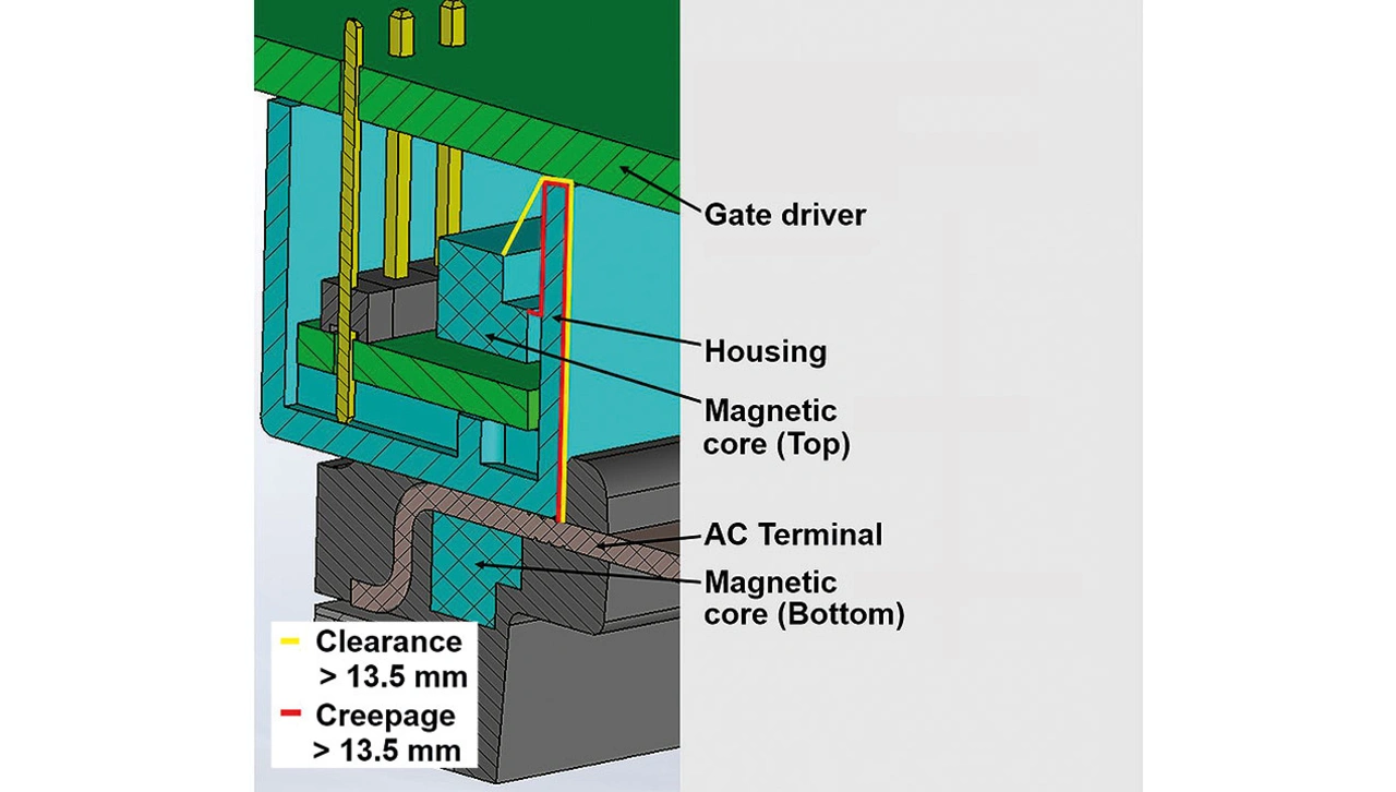 Durch die Verbindung des Sensors mit der Oberseite des Gehäuses ergibt sich ein Design mit ausreichenden Abständen für Luft- und Kriechstrecken zwischen den Anschlüssen außerhalb des Gehäuses. Somit werden die Anforderungen an die Hochspannungsisolierung erfüllt und das Layout der Gate-Treiberplatine vereinfacht.