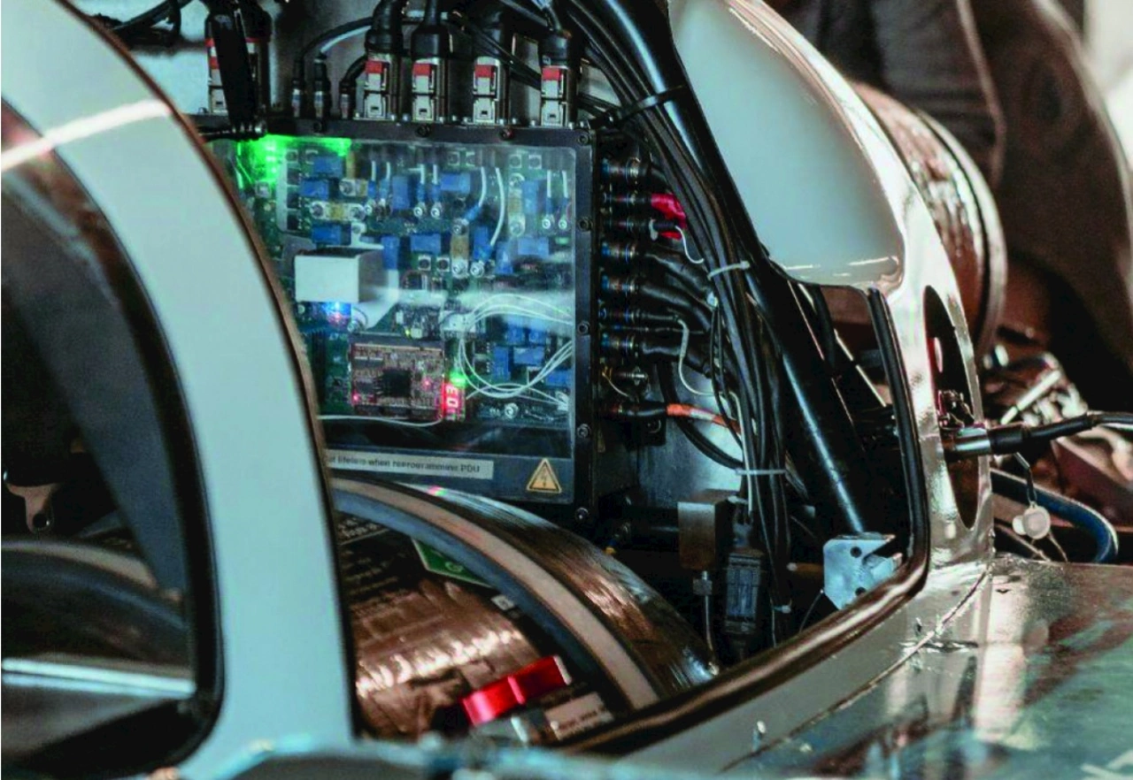 Der Forze 8 verwendet ein dezentrales System. Jeder Knoten hat seine eigene Funktion. Einige sind für ein ganzes Teilsystem verantwortlich, wie zum Beispiel das Antriebssystem oder das Brennstoffzellensystem, andere bieten einfach eine Schnittstelle zu nahegelegenen Sensoren und Aktoren. Bild 1 zeigt einen typischen Knoten im Auto. Im Kasten »Die embOS-gesteuerten Knoten und ihre Aufgaben im Forze 8« auf Seite 23 findet sich außerdem eine Auflistung aller Knoten mit ihrer jeweiligen spezifischen Funktion. Die Power Distribution Unit (Bild 2) verteilt die Niederspannungsversorgung und überwacht sicherheitskritische Systeme.