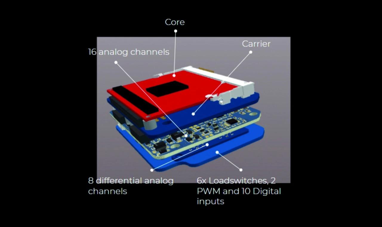 Der CPS ist das Gehirn des Forze 9. Hier werden alle Daten, die im gesamten Fahrzeug anfallen, gesammelt und entsprechend verarbeitet. Der CPS besteht aus acht Platinen, die übereinander gestapelt sind. Jede Platine trägt einen Arm-Cortex-M7-Mikroprozessor, genauer gesagt ein i.MX-RT1062-OEM-Board, das wiederum von Embedded Artists hergestellt wurde. Außerdem erhält jede Trägerplatine Zugriff auf eine Modulplatine, die aufgabenspezifische Schaltungen enthält. Diese Module werden von der Seite in den Steckverbinder auf der Trägerplatine geschoben. Intern verwenden die CPS-Kerne einen CAN-FD-Bus zur Kommunikation.
