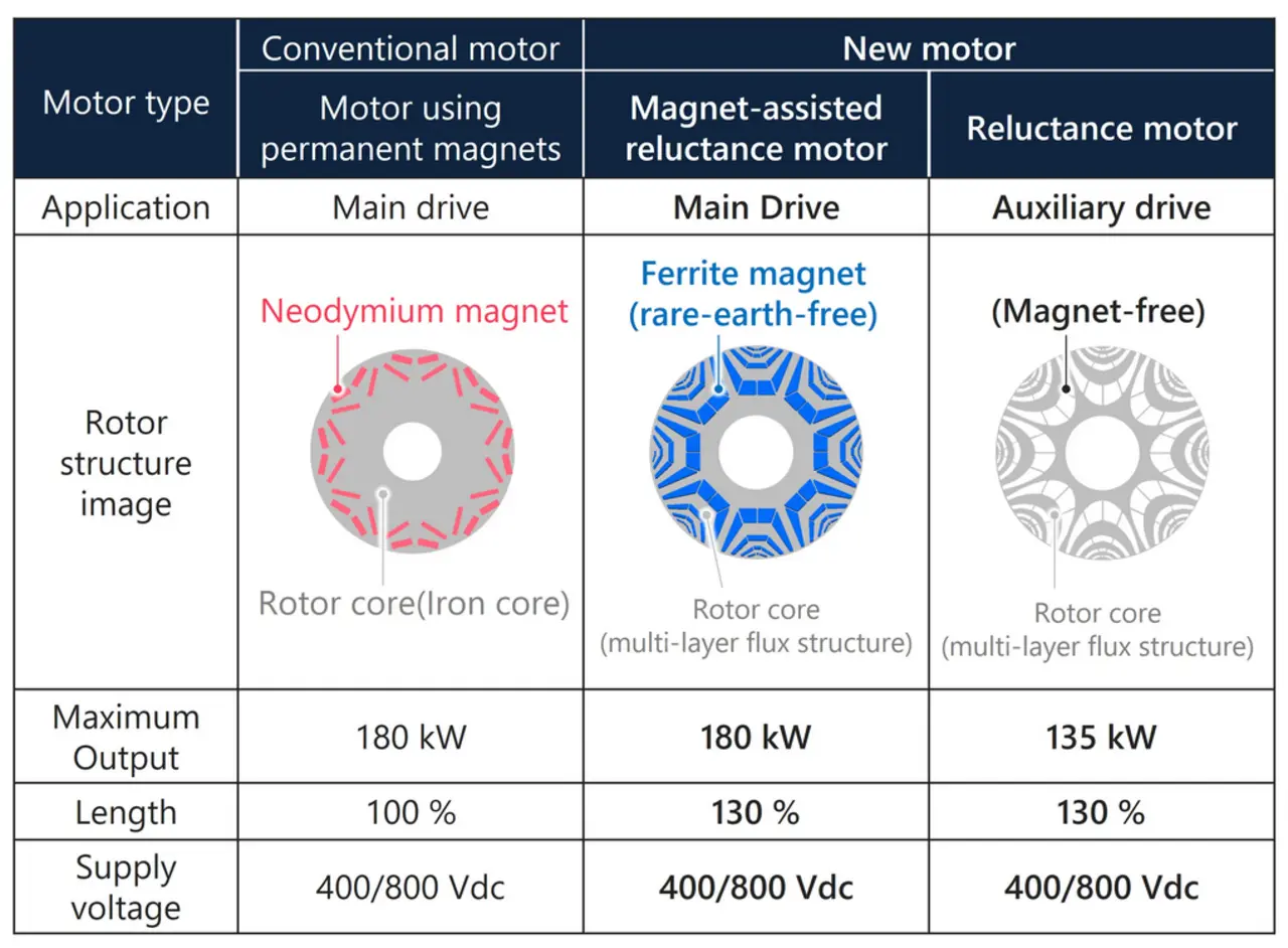 In dem neuen Motor entsteht die Rotationskraft durch Magnetismus, der während des Betriebs im rotierenden Eisenkern des Rotors erzeugt wird. Der Hauptantriebsmotor, der kontinuierlich für den Vortrieb genutzt wird, ist mit Magneten ohne seltene Erden ausgestattet und erreicht eine Leistung von 180 kW. Dadurch kann der bislang übliche Permanentmagnetmotor in BEV-Antriebssystemen ersetzt werden, der große Mengen seltener Erden benötigt. Für den Nebenantrieb zur Leistungsunterstützung setzt Astemo auf einen Synchronreluktanzmotor, der Energieverluste während des Freilaufs verhindert. Zusammen erreichen Haupt- und Nebenantrieb eine Gesamtleistung von 315 kW. Die praktische Anwendung von Synchronreluktanzmotoren ist für das Jahr 2030 geplant. Ihr Einsatz in Serienfahrzeugen wäre weltweit eine Premiere.