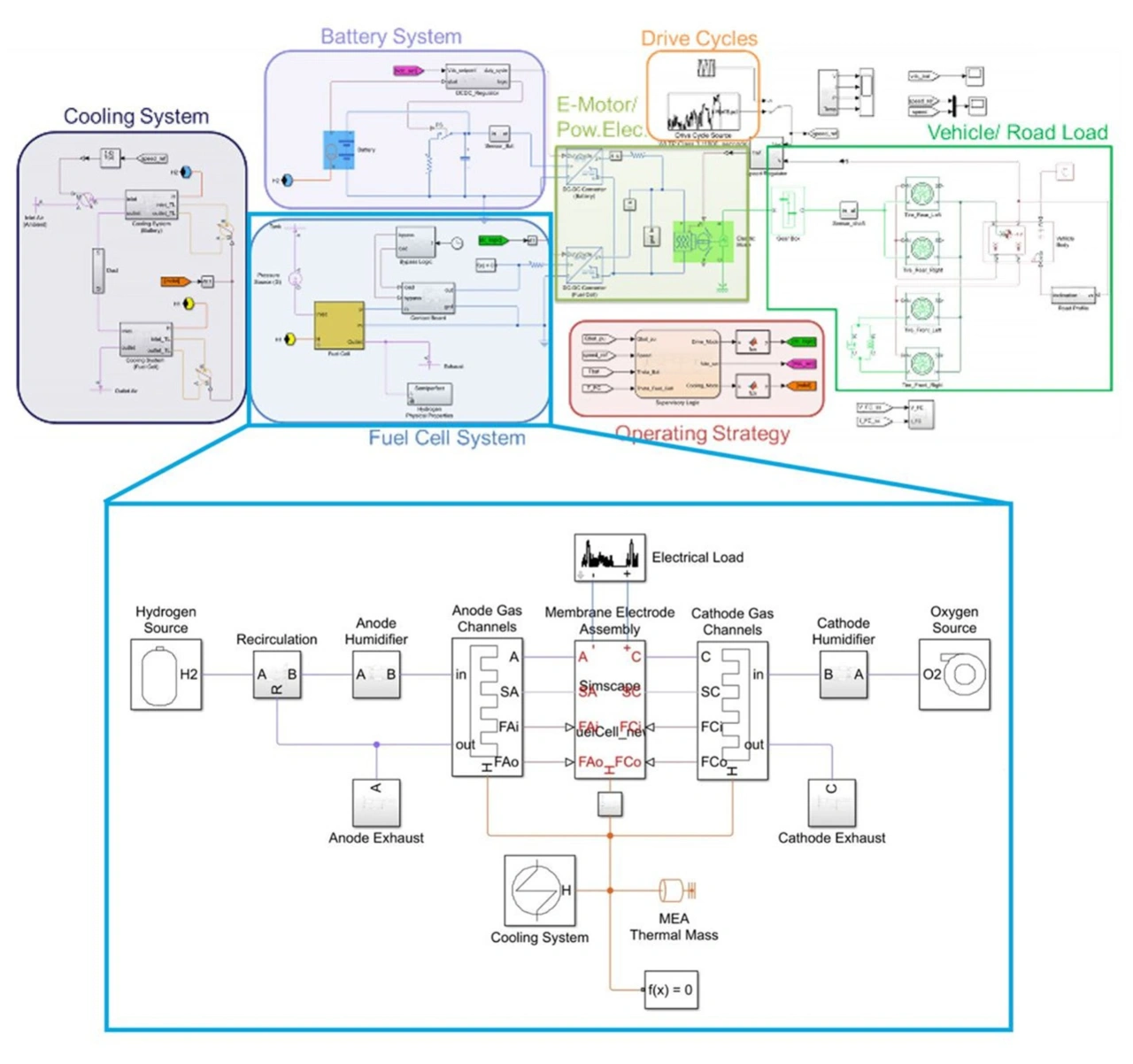 Am weitesten verbreitet in den genannten Anwendungen sind Polymerelektrolyt-Membran-Brennstoffzellen (PEM-FCs), auch Protonenaustausch-Brennstoffzellen genannt. Ihre Modellierung stellt aber für Ingenieure eine erhebliche Herausforderung dar. Denn auch wenn das Konzept einfach klingt, sind PEM-FCs in ihrer Gesamtdynamik hochkomplex. Sie bestehen aus dem Zellstapel mit Elektroden und Membran sowie unter anderem dem Tank, Druckreduzierer, Kompressor sowie Bestandteilen zum Feuchtigkeits- und thermischen Management.
