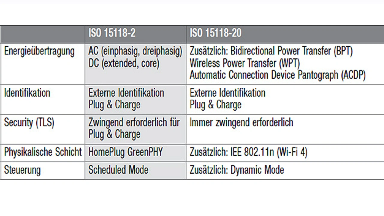 Im Jahr 2022 haben die zuständigen Gremien den Nachfolger der ISO 15118-2 freigegeben, die ISO 15118-20. Der Standard ergänzt die bestehende Norm um weitere Funktionalitäten, die zukünftig für die Elektromobilität essenzielle Bedeutung haben werden (Tabelle). Dazu gehören Bidirectional Power-Transfer (BPT), welches das erwähnte Rückspeisen von Energie ins Stromnetz möglich macht, Wireless Power-Transfer (WPT) für induktives Laden ohne Kabel sowie Automatic-Connection-Device-Pantograph (ACDP). Die letztgenannte Technik regelt das konduktive Laden mit hohen Leistungen via Pantographen, beispielsweise bei Elektrobussen.