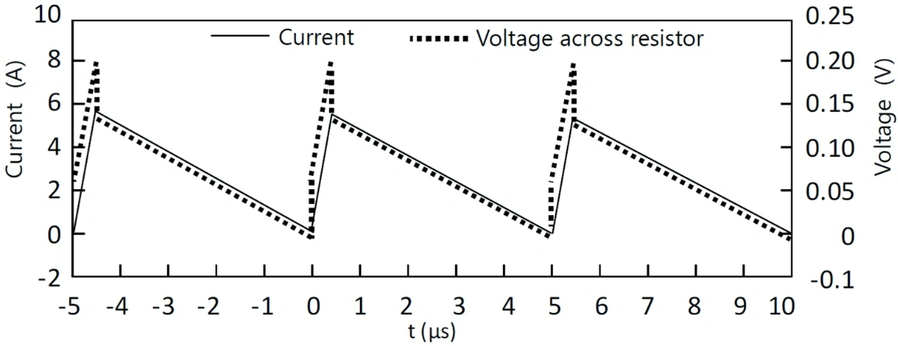 In der Realität gibt es jedoch verschiedene Einflussfaktoren, die zu einem abweichenden Messergebnis führen können, wenn sie von Vornherein nicht beachtet und entsprechende Gegenmaßnahmen ergriffen werden. Bei hochfrequenten Strömen spielt die parasitäre Induktivität diesbezüglich die größte Rolle. Sie induziert bei einer Stromänderung eine elektromotorische Kraft, auch Urspannung genannt. Diese wird umso größer, je stärker die Stromänderung über einen gewissen Zeitraum ausfällt bzw. je kürzer der Zeitraum für die Stromänderung ist. Bild 2 zeigt einen typischen Strom- und Spannungsverlauf über einem Widerstand mit größerer parasitärer Induktivität.