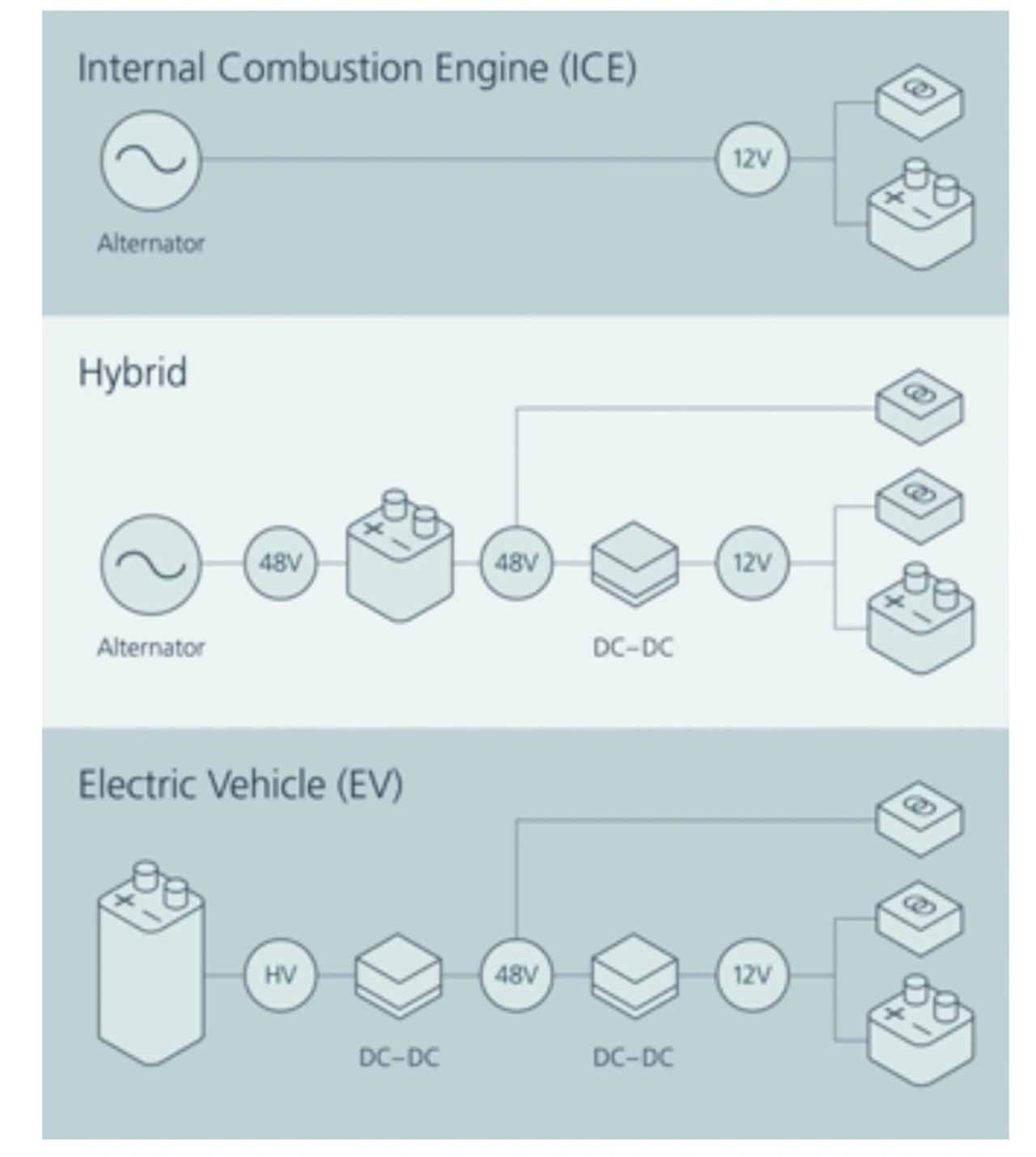 Bei Elektrofahrzeugen, die mit einer 400-V- oder 800-V-Batterie ausgestattet sind, bedeutet der Einbau einer zusätzlichen Batterie sowie der zugehörigen Elektronik für das Powermanagement der oben genannten Komponenten unnötige Stücklistenkosten. Bild 1 verdeutlicht die Komplexität der Stromversorgungsarchitekturen von Hybrid- und Elektrofahrzeugen im Vergleich zum Verbrennungsmotor.