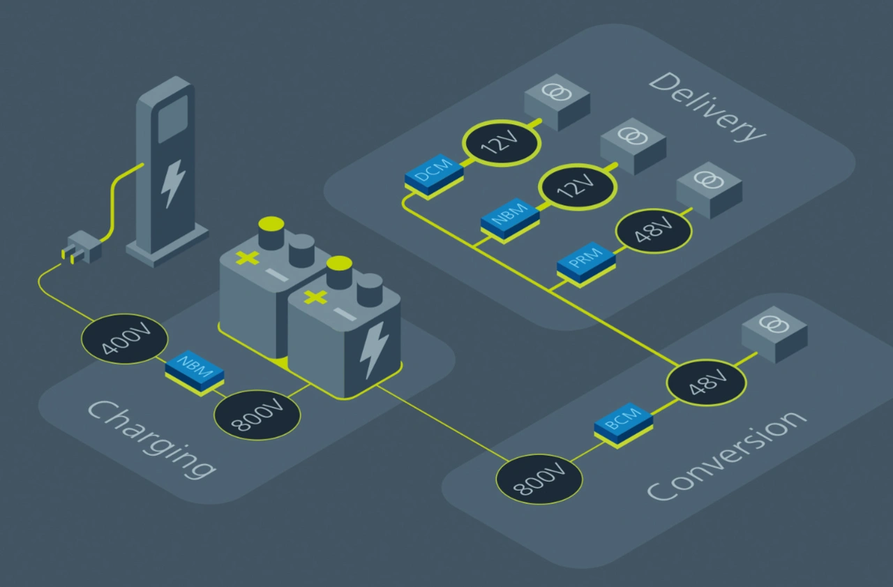 Mit anderen Worten: Aus Sicht der DC/DC-Stromversorgung ist bei einem Elektrofahrzeug eine Leistungsumwandlung und -verwaltung von 50 kW und mehr erforderlich, verglichen mit < 3 kW bei einem herkömmlichen Fahrzeug mit Verbrennungsmotor. Folglich ist es von zentraler Bedeutung, eine zuverlässige und effiziente Leistungsumwandlung auf kleinstem Raum und mit geringstem Gewicht zu erreichen. Eine Stromversorgungsarchitektur für Elektrofahrzeuge muss den Antriebsstrang, das bordeigene Laden und das Laden über die Infrastruktur sowie die vorhandenen Systeme unterstützen.