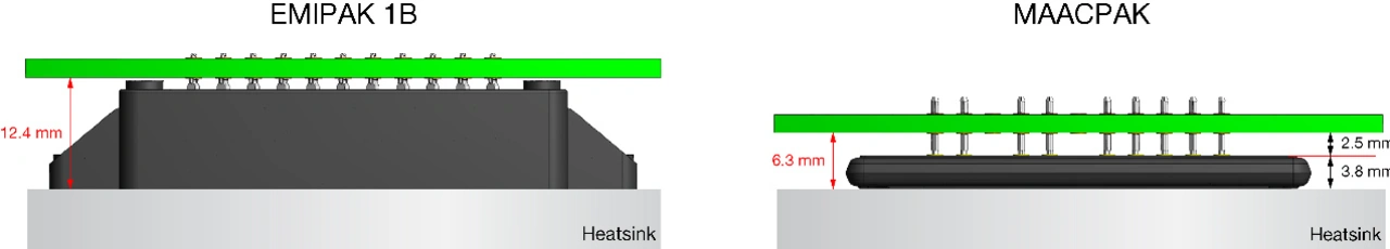 Vishay hat mit der Weiterentwicklung des »EMIPAKs« zum »MaacPak« in zwei Bereichen erhebliche Fortschritte erzielt. Zum einen wird das MaacPak Transfer-Mold Verfahren genutzt und damit dasselbe, bereits vielfach qualifizierte Material, das in den meisten diskreten Gehäusen verwendet wird. Zum anderen wurde die Höhe von vormals 12,4 auf 6,3 mm reduziert, wodurch die Leitungsinduktivitäten und das Volumen auf die Hälfte ihrer vorherigen Werte reduziert werden konnten. Aufgrund aller Änderungen in der mechanischen Konstruktion konnte die thermische Anbindung an die Kühlfläche um ca. 20 Prozent verbessert werden.