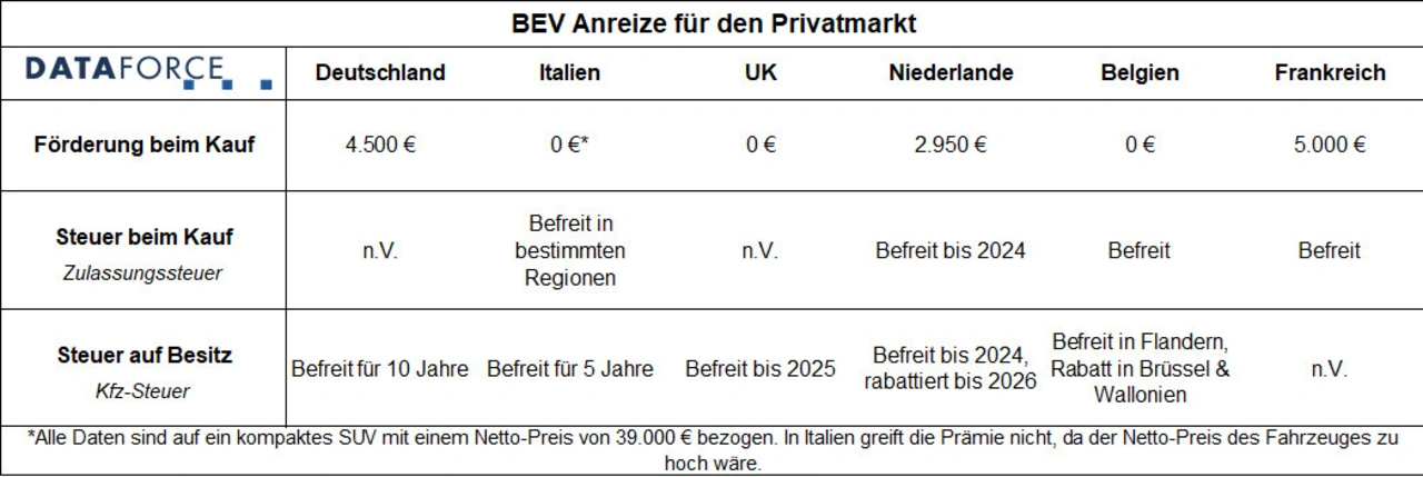 Für die Berechnung der Förderungen hat Dataforce sich die Anreize in den Ländern angesehen und verglichen. Für die Angaben und Berechnungen wurde ein kompaktes SUV als Standard genommen, da sich im Privatmarkt die meisten Kunden heutzutage für dieses Segment entscheiden (22,6 Prozent Marktanteil 2022, EU 27+EFTA+UK).