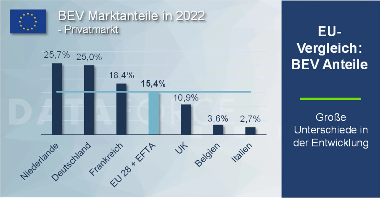 Genau das sieht Dataforce auch in den Niederlanden, Deutschland und Frankreich. Die drei Länder mit der höchsten Förderung haben auch die höchsten BEV-Anteile. Der Marktanteil im Privatmarkt liegt hier deutlich über dem EU-Durchschnitt von 15,4 Prozent. Länder mit vergleichbar niedriger Förderung wie UK, Belgien und Italien liegen unter dem Durchschnitt. Im Falle der letzten beiden sogar deutlich.