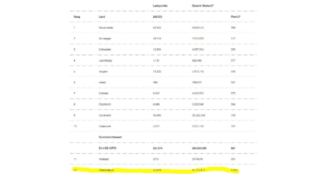 Eine andere Perspektive auf die gleichen Zahlen, allerdings schon Stand Q1 / 2021, hat der VDA eingenommen, dessen Auswertung setzt die Anzahl der Ladepunkte zu den zugelassenen PKW ins Verhältnis. »Je mehr öffentliche Ladepunkte es gibt, desto attraktiver ist es für den Verbraucher, auf Elektroantrieb umzusteigen,« teilt der Verband mit. Auch mit dieser Betrachtungsweise steht die Niderland ganz oben auf dem Ladeinfratstrukturstreppchen, dort gibt es einen Ladepunkt pro 109 Autos.