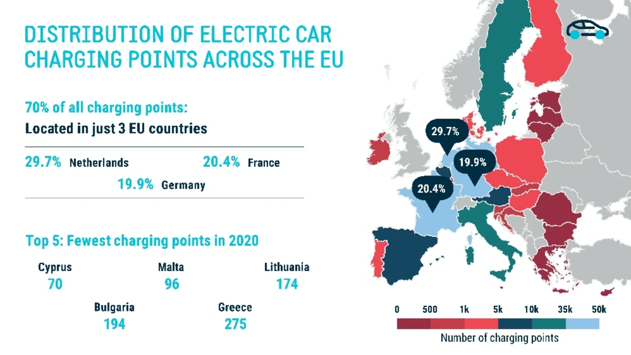 Der zweigeteilte Ausbau der Infrastruktur entwickelt sich zwischen reicheren EU-Mitgliedsstaaten in Westeuropa und Ländern mit einem niedrigeren Bruttoinlandsprodukt (BIP) in Ost-, Mittel- und Südeuropa. Länder mit einer beträchtlichen Landmasse, aber einem niedrigeren BIP, wie Polen (0,8 % der EU-Ladegeräte) und Spanien (3,3 %), scheinen ins Hintertreffen zu geraten, warnt der ACEA und fordert sofortige und die Balance herstellende Investitionen.