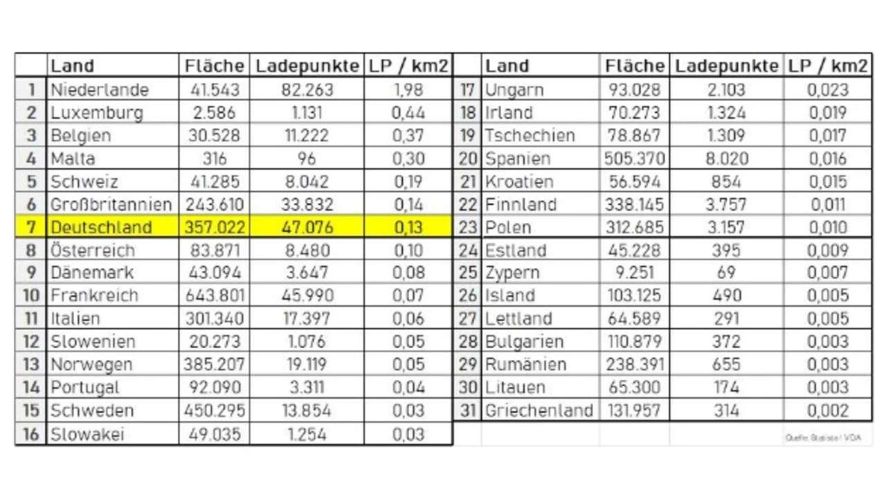 Auf den Plätzen 2 und 3 liegen Norwegen und Schweden, selbst kleine Länder wie Luxemburg und Island landen mit 377 bzw. 551 Autos pro Ladesäule unter den Top 6. Im europäischen Durchschnitt inklusive Großbritannien sind es 887 Autos pro Ladepunkt. Hildegard Müller, Präsidentin des VDA, sagt dazu: »Eine europaweite Ladeinfrastruktur ist derzeit nicht vorhanden, der flächendeckende Ausbau liegt leider in weiter Ferne.« Deutschland liegt mit 1014 Autos pro Ladepunkt auf Platz 12 und deutlich unter dem europäischen Schnitt.
