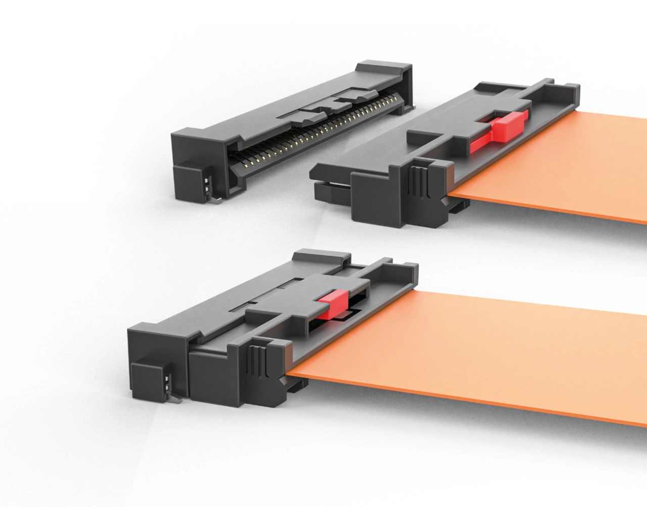 Die Kerntechnologie ist das Pullforce-System des Y-Lock. Dabei wird das flexible Flachkabel (FFC) oder die flexible Leiterplatte (FPC) mit Hilfe eines montierten Stiffeners in den Steckverbinder eingeführt. Er rastet dann automatisch in zwei Stufen ein, zunächst über seitliche Verriegelungshaken und im nächsten Schritt über die Frontverriegelung.