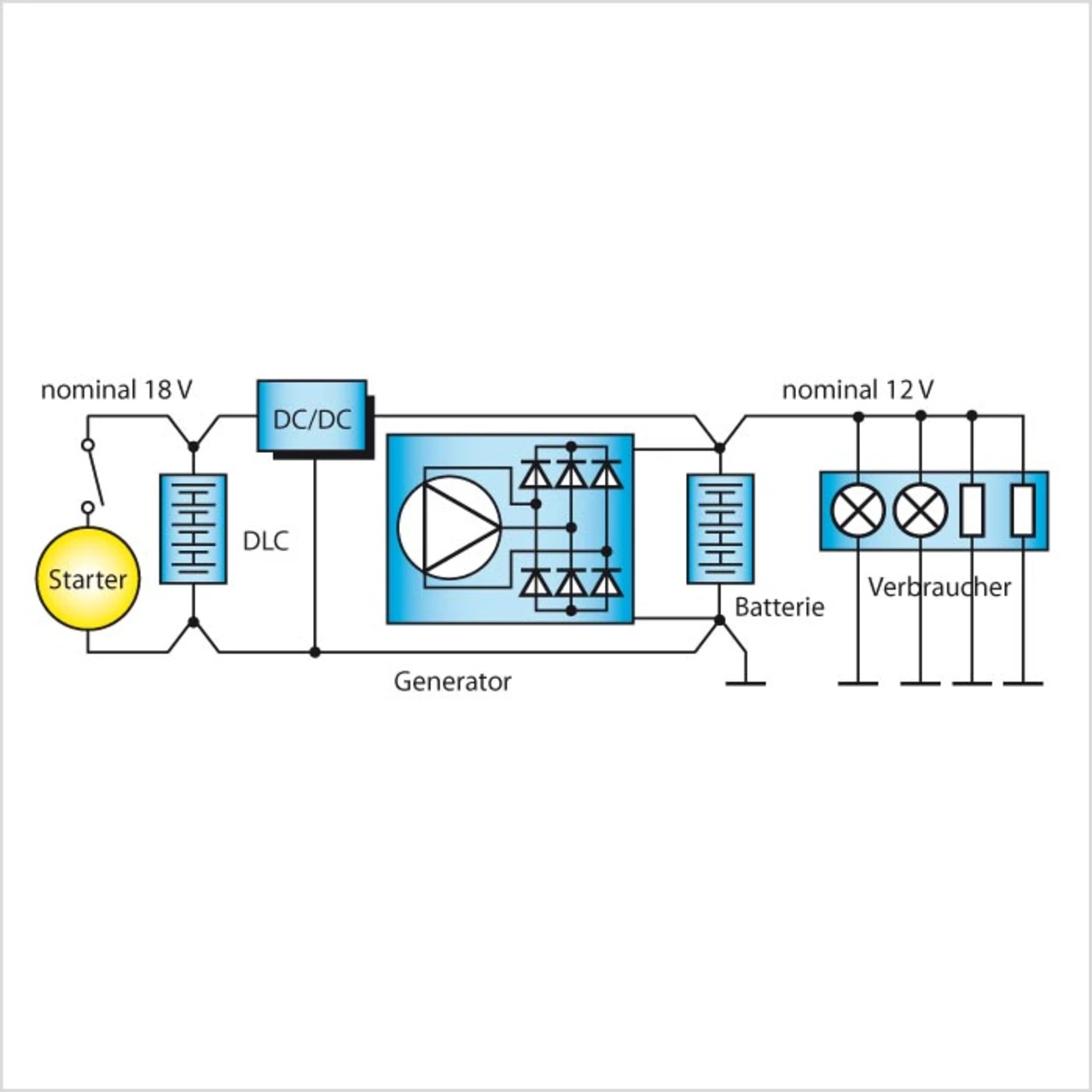 In einem ersten Weiterentwicklungs-Schritt wird die Starterversorgung von der Bleisäurebatterie entkoppelt. Ein Doppelschichtkondensatorstapel versorgt den Starter, wobei die Nachladung mittels eines elektronischen DC/DC-Spannungswandlers aus dem Bordnetz erfolgt. Die Bordnetzspeisung erfolgt, wie bisher, bei Fahrt aus dem Generator und bei Fahrzeugstillstand aus der Bleisäurebatterie (Bild 4).