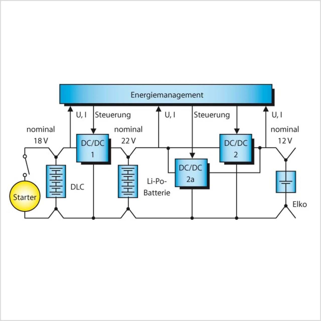 In einem weiteren Entwicklungsschritt wird die Bleisäurebatterie durch eine Li-Polymer-Batterie ersetzt. Da die Stabilität der Generatorspannung nicht den Anforderungen einer solchen Batterie entspricht, wird sie durch einen weiteren Spannungswandler DC/DC 2 (Bild 5) vom Generator/ Bordnetz entkoppelt. Der Spannungswandler DC/DC 1 entspricht hier dem DC/DC-Spannungswandler von Bild 4. Ein zusätzlicher Kondensator (Elko) übernimmt teilweise die Bordnetzfilterung.