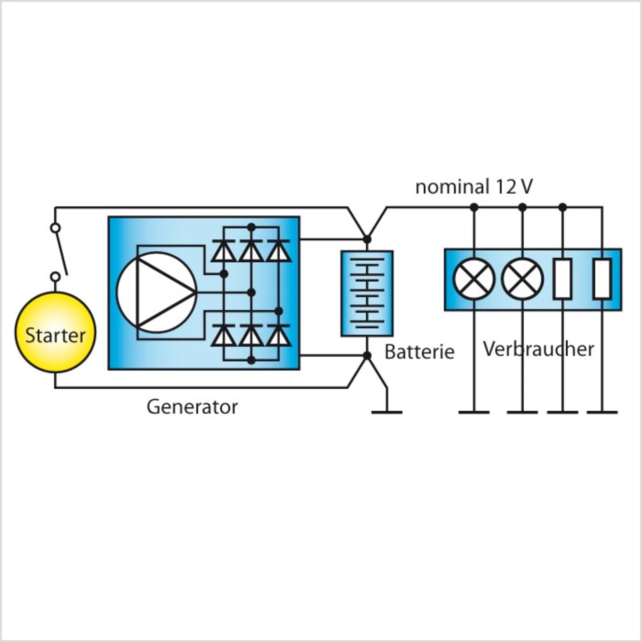 Das heutige 12-VKfz-Bordnetz ist dadurch gekennzeichnet, dass sämtliche Energielieferanten/ Verbraucher eine gemeinsame Spannungslage von nominal 12 V haben und der Energieaustausch über eine gemeinsame Leitungsebene erfolgt. Solange der Verbrennungsmotor läuft und den Generator antreibt, deckt er den Gesamtbedarf an elektrischer Energie. Die Batterie übernimmt zusätzliche Bedarfsspitzen und wirkt damit als Puffer. Solange der Generator den Energieverbrauch decken kann, ist das System stabil. Bei Fahrzeugstillstand ist dann die Batterie für die Netzversorgung zuständig (Bild 3).