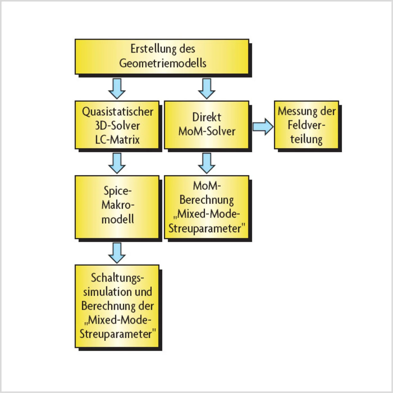 Ausgangspunkt für die Untersuchung des FlexRay-Steckers bildet ein Prozess mit verschiedenen Phasen, die in einer festen Reihenfolge durchlaufen werden (Bild 1). Dabei werden zwei verschiedene Simulationswege verwendet: einerseits über die Feldberechnung (Momentenmethode) und anderseits über die Schaltungssimulation (PSpice). Aus den Simulationsergebnissen werden in beiden Fällen die „Mixed-Mode-Streuparameter“ (vgl. [4, 5]) berechnet und abschließend mit den entsprechenden Messungen verglichen. Die einzelnen Schritte werden im Folgenden näher erläutert.