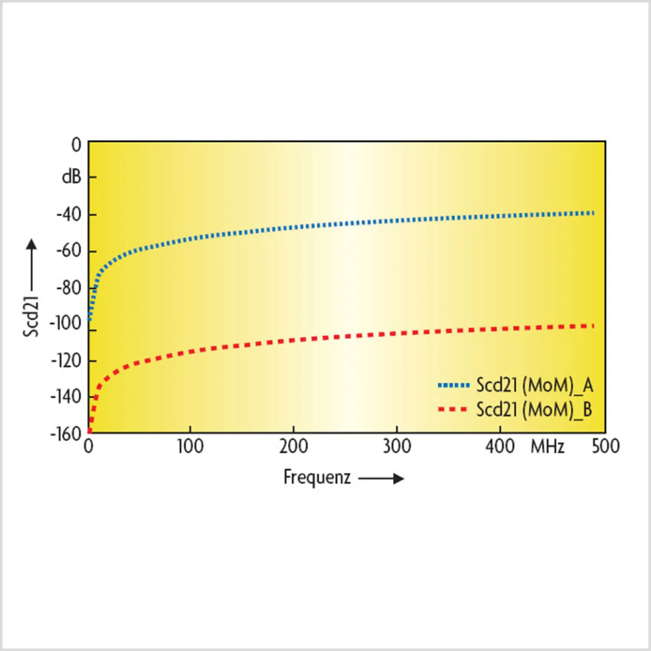 Nach einer erfolgreichen Modellierung des FlexRay-Steckers lassen sich weitere Untersuchungen mittels der Simulation durchführen. Bild 7 zeigt die MoM-Simulationsergebnisse des Scd21-Streuparameters bei Variante A und B. Man sieht in diesem Fall, dass die gekoppelte Gleichtaktwelle in den benachbarten Pins bei Variante A deutlich höher ist als bei Variante B. Die hinreichenden EMV-Simulationsergebnisse zeigen, dass es hohe Anforderungen zur Vermeidung von Störemissionen und zur Erhöhung der Störfestigkeit des FlexRay-Systems bei Schaltungsunsymmetrien gibt.