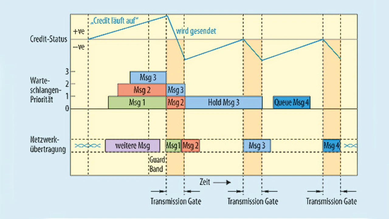 Damit störender Traffic sich nicht auf ein Netzwerk auswirkt, müssen Ethernet Switches die Zykluszeiten aller Control Traffics (Klasse-A-Traffic) kennen. Non-Control Traffic wird während der regulären Gates blockiert. So wird sichergestellt, dass der Sende-Port für einen wichtigen Control Stream verfügbar ist, wenn er benötigt wird. Die Verwaltung dieser Time Gates ist in der „Time-Aware Shaper“-Funktion des IEEE 802.1Qbv definiert. Nachrichten befinden sich in einer Warteschlange, während ein Credit aufläuft. Sobald dieser Credit positiv und ein Time Gate verfügbar ist, beginnt die Nachrichtenübertragung. Diese Anordnung wird in Bild 3 gezeigt.