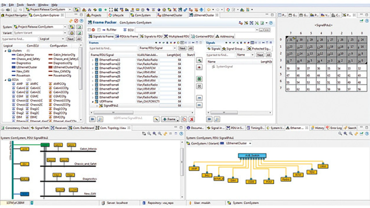 In einer komplexen Fahrzeugarchitektur kann es für eine bestimmte Nachricht viele Hops geben, weil sie durch viele verschiedene Domänen-Controller und Netzwerk-Links läuft. Der Ethernet Switch Timing Jitter ist für jedes Segment kumulativ. Er hängt von den Klassen und Prioritäten der Nachricht sowie von den Auswirkungen der Kommunikationswarteschlangen und Shaper ab. Simulations-Tools dienen der Analyse von Worst-Case-Pfaden. Mentor Graphics bietet mit Volcano VSA COM ein Produkt an, mit dem sich das Timing von komplexen Ethernet-Architekturen definieren und analysieren lässt. Das Szenario in Bild 4 definiert einen kleinen Testfall einer Publisher- und einer Receiver-ECU, die über Ethernet kommunizieren.