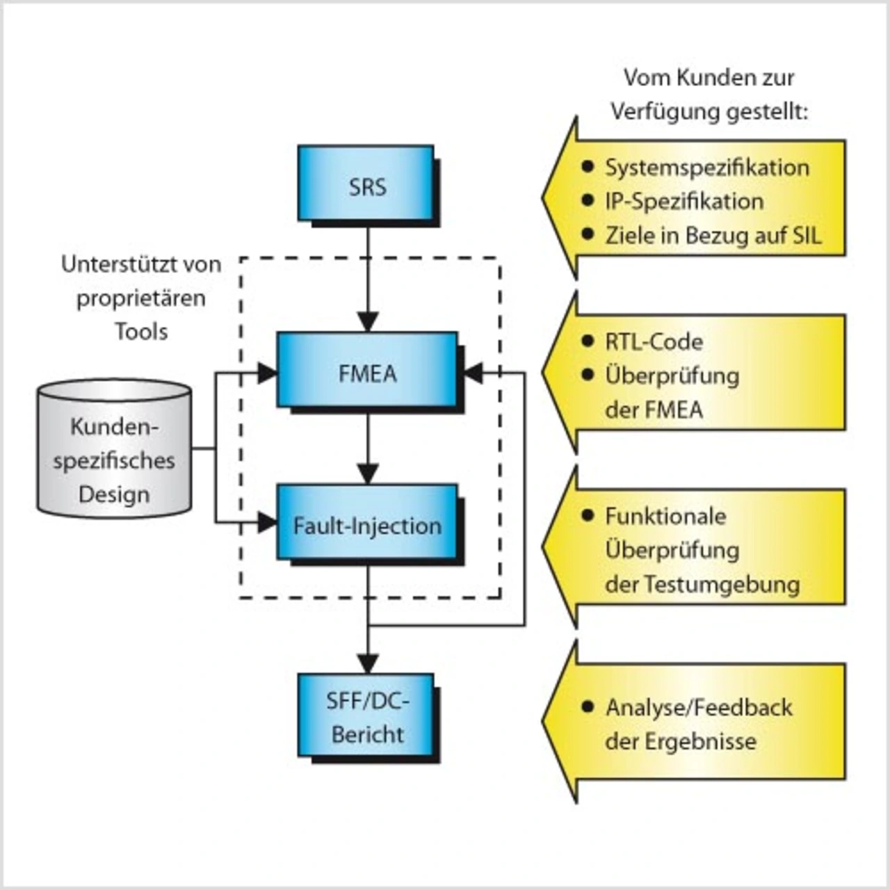 FaultRobust ist ein plattformbasiertes Konzept aus einer IEC-61508-konformen Design- und Validierungs-Methodik auf der Basis von FMEA (Failure Mode and Effects Analysis) und Fehlerinjektion. Weitere Bestandteile sind eine flexible, konfigurierbare Bibliothek aus Hardware und Software-IP ergänzend zu den SoC-Subsystemen und eine Tool-Suite auf der Grundlage existierender Compiler für die Hardware/ Software-Integration und den Konfigurationsablauf. Jedes faultRobust- IP (fRIP) kann eigenständig genutzt oder mit anderen fRIPs zu einer Komplettlösung kombiniert werden. Das Rückgrat des Konzepts ist die faultRobust-Methodik (Bild 2). Mit Scripts auf Basis kommerziell verfügbarer EDA-Tools extrahiert das fRFMEA-Tool Informationen aus der Safety Requirements Specification (SRS) und dem Design-Datenbestand und gibt sie in ein sehr detailliertes Failure-Mode- and Effects-Analysis- Worksheet ein. Fehlermodelle und Ausfallmodi werden dann nach IEC-Richtlinien begutachtet. SFF (Safe Failure Fraction) und Diagnose-Abdeckung werden anschließend mit statistischen Formeln im FMEA-Worksheet automatisch berechnet.