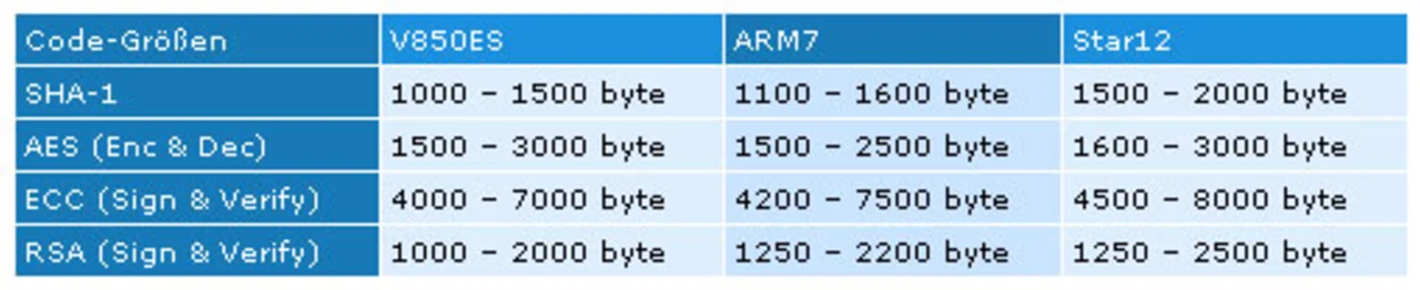 Zum Vergleich zeigt Tabelle 2 die Bandbreite erreichbarer Laufzeiten gängiger Standardverfahren, wie sie z.B. auch in der HIS-Spezifikation zum sicheren Flashen von Steuergeräten vorgesehen sind. Die Werte beziehen sich auf eine Implementierung in ANSI-C und sind für drei im Automobil-Umfeld übliche Prozessoren angegeben. Tabelle 3 zeigt dazu die gängigen Code-Größen auf denselben Prozessoren.