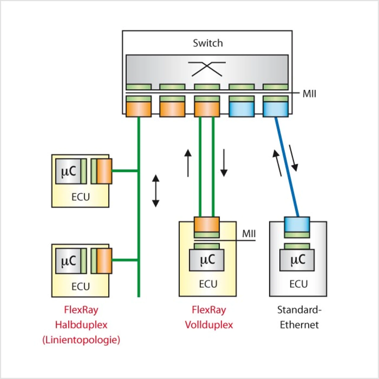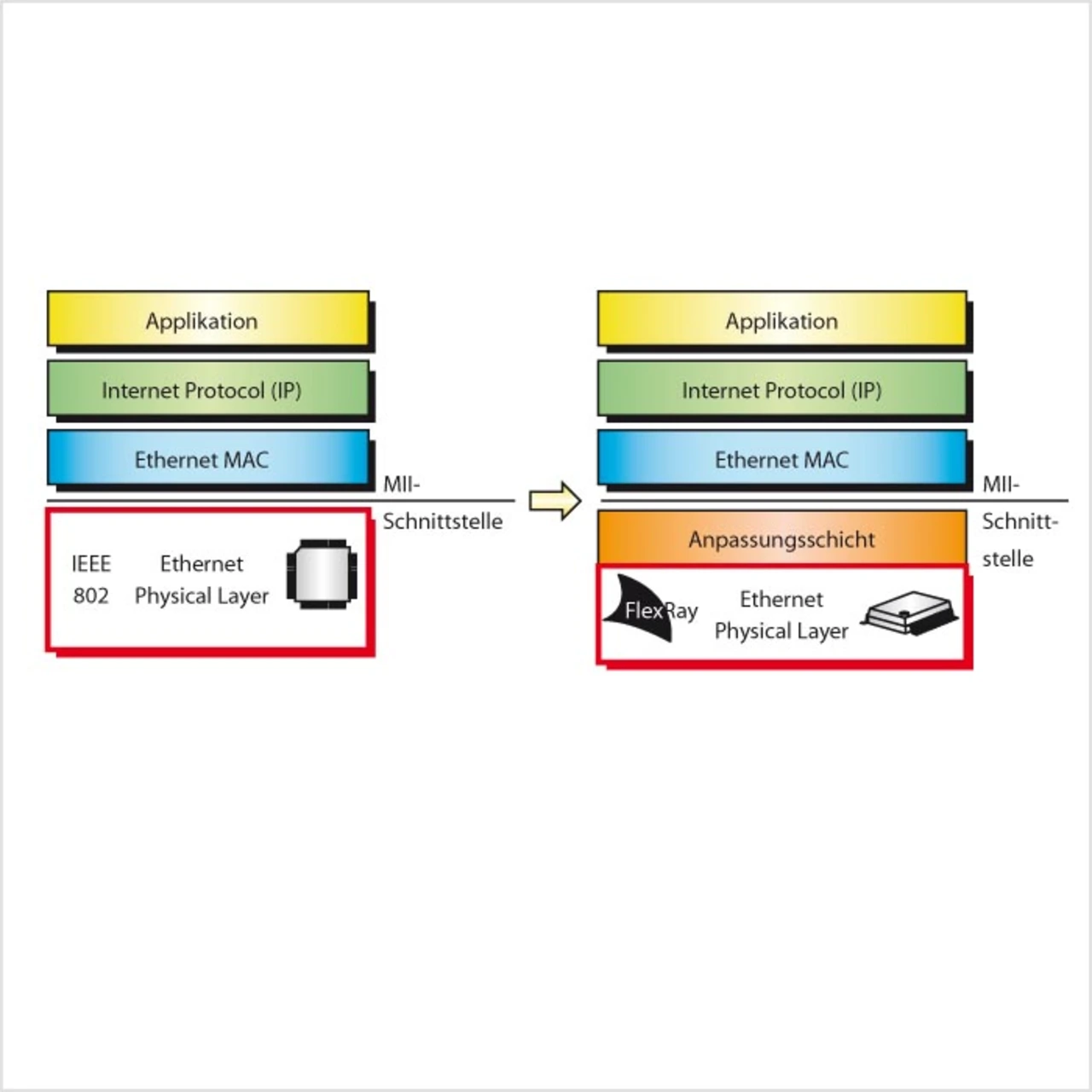 Das realisierte System kann an jedem beliebigen Mikroprozessor angeschlossen werden, der über eine MII-Schnittstelle verfügt. Weder der Mikroprozessor noch die Applikationen bemerken dabei, dass sie nun über den FlexRay-Transceiver anstelle des Ethernet-Transceivers kommunizieren. Das FlexRay-System verhält sich gegenüber dem Mikroprozessor wie ein Standard-Ethernet-Baustein. Der Unterschied liegt lediglich in der physikalischen Übertragungstechnik. Anstelle von geschirmten Leitungen und aufwendigen Steckverbindern, wie sie bei Standard-Ethernet notwendig sind, können nun für die Kommunikation ungeschirmte verdrillte Doppeladern und einfache Stecker genutzt werden. Die Verwendung von zertifizierten FlexRay-Transceiver-Bausteinen garantiert dabei die Einhaltung der Automotive-Anforderungen (EMV, Störsicherheit).