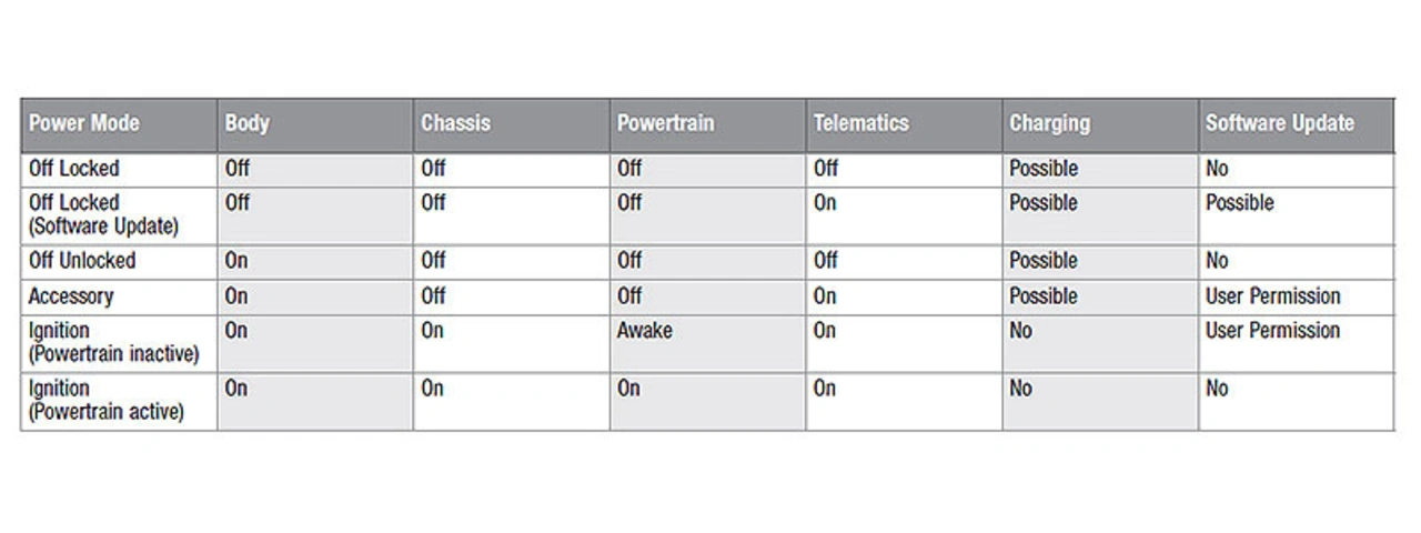 Moderne Fahrzeuge verfügen oft über mehrere Leistungsmodi, die steuern, welche Komponenten angetrieben werden oder aktiv sind. Bei einem Fahrzeug mit einem herkömmlichen Schlüssel gibt es in der Regel vier Stellungen am Zündschloss, was vier bis sechs Leistungsmodi entspricht, von ausgeschaltet und gesperrt bis zum Anlassen (Tabelle 1).