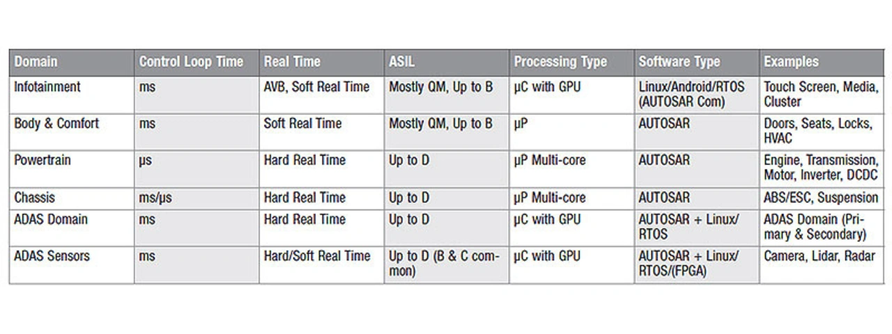 Ein Designtool, das Analysen unterschiedlicher Funktionsverteilungen ermöglicht, um die Folgen jeder Zuordnung vorherzusagen, kann eine erhebliche Menge Zeit sparen und von Beginn an korrekte Architekturen unterstützen. Bei funktionalen Zuordnungen zu Steuergeräten ist es entscheidend, die spezifische Art der Verarbeitung für jedes Steuergerät zu berücksichtigen. Die für die Hauptverarbeitung zuständigen Steuergeräte in jeder Domäne haben unterschiedliche Eigenschaften hinsichtlich der Echtzeit- und Sicherheitsanforderungen und der Hardwareausstattung (Tabelle 2).