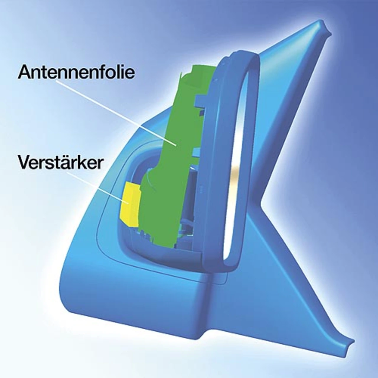 Neues aus dem Bereich der Antennentechnik zeigte die Hirschmann Car Communication GmbH (www.hirschmann-car.com). Basierend auf einer neu entwickelten Antennen-Folientechnik wurde ein Antennensystem vorgestellt, das sich komplett in den beiden Außenspiegeln eines Fahrzeuges integrieren lässt (Bild 3). Das System besteht aus Antennen für Radio- (AM/FM) und Fernsehempfang, Mobilfunk und Navigation sowie in jedem Spiegel einem Antennenverstärker. Die Antennenstrukturen werden dabei zunächst auf eine Folie aufgebracht und diese dann in das Spiegelgehäuse integriert oder schon während des Spritzprozesses eingebracht. Das Konzept kann bei allen Kunststoffspiegeln Anwendung finden, auch bei Transportern und Lkws.
