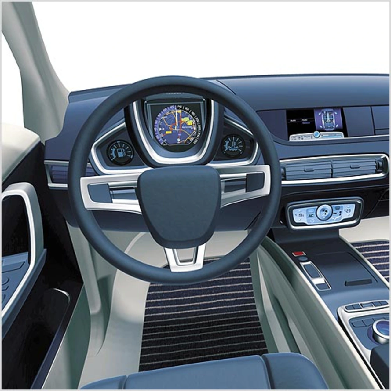 Ein komplettes Konzeptfahrzeug zeigte der Cockpit-Spezialist Johnson Controls (www.jci.com). Auffällig ist dabei vor allem das Fahrerinformationssystem, das anstatt der üblichen analogen Instrumente auf ein TFT-Display setzt, in dem verschiedene Informationen wie Tempolimits, Schaltempfehlungen oder situationsabhängige Warnungen dargestellt werden können (Bild 1). Die Geschwindigkeit wird über einen kosteneffizienten, mechanischen Ringzeiger angezeigt. Die Beleuchtung der dazugehörigen Ziffernskala erfolgt über eine platzsparende Elektrolumineszenzfolie, kann aber bei Bedarf auf LED-Beleuchtung umgerüstet werden.