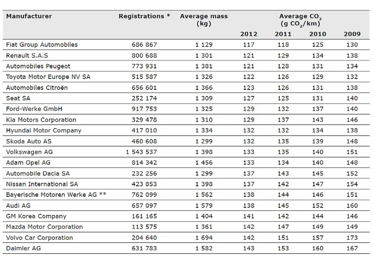 Laut dem jüngsten Bericht der europäischen Umweltagentur (EEA) haben die meisten der großen Automobilhersteller (mit mehr als 100.000 Fahrzeugen pro Jahr) 2012 ihre Ziele bezüglich des durchschnittlichen CO2-Ausstoßes erfüllt.