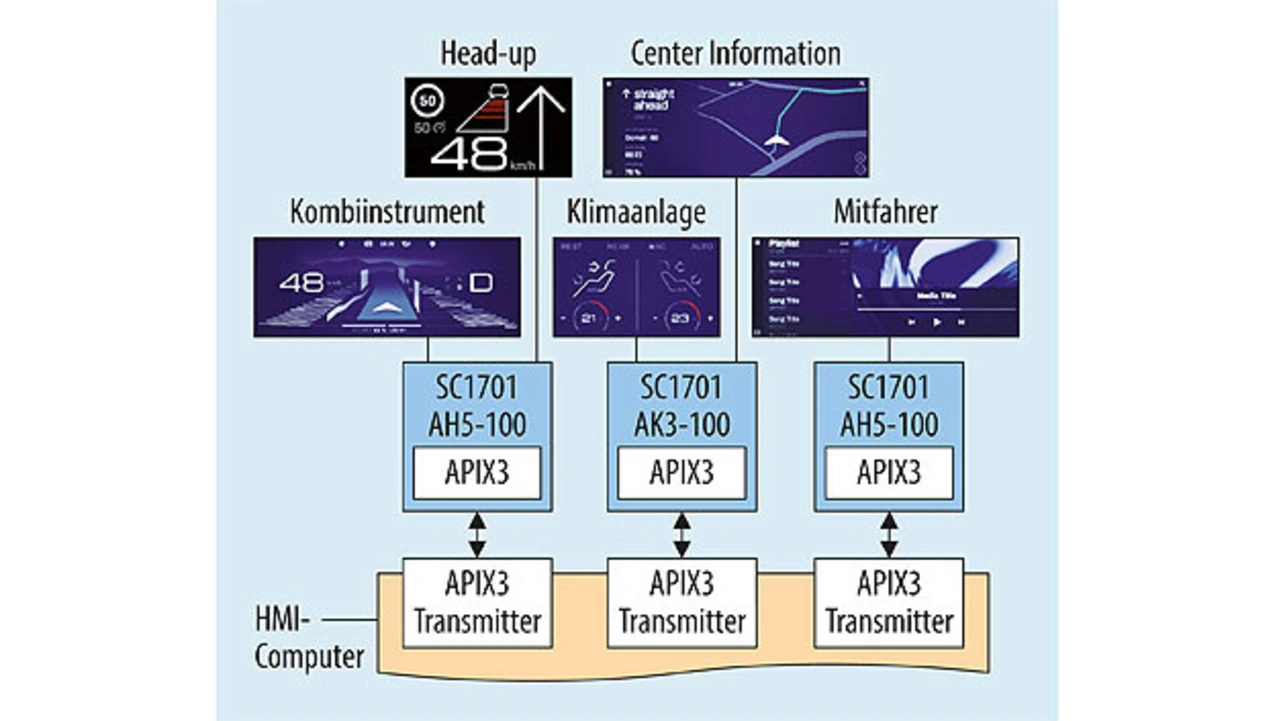Der Videolink ist für die Übertragung der Videodaten zum Display (Up-Stream), aber auch für die Kommunikation vom Display zurück zur zentralen Grafikeinheit zuständig (Side-Band oder Back-Channel). Die hierbei verwendete APIX-Technologie kann all diese Eigenschaften vorweisen und wird aktuell in der dritten Generation, APIX 3, in den Markt eingeführt. APIX 3 ermöglicht Geschwindigkeiten bis zu 12 Gbit/s auf dem Up-Stream sowie 187 Mbit/s auf dem Down-Stream. Dabei ist die typische Kabellänge, die im Auto für die Anbindung eines hochauflösenden Displays erforderlich ist, trotz der hohen Bandbreite realisierbar. Die Anbindung eines Displays mittels APIX 3 an eine zentrale Grafikeinheit ermöglicht die Umsetzung des erforderlichen Sicherheitskonzeptes für den Videolink, angepasst an die jeweilige Anwendung.