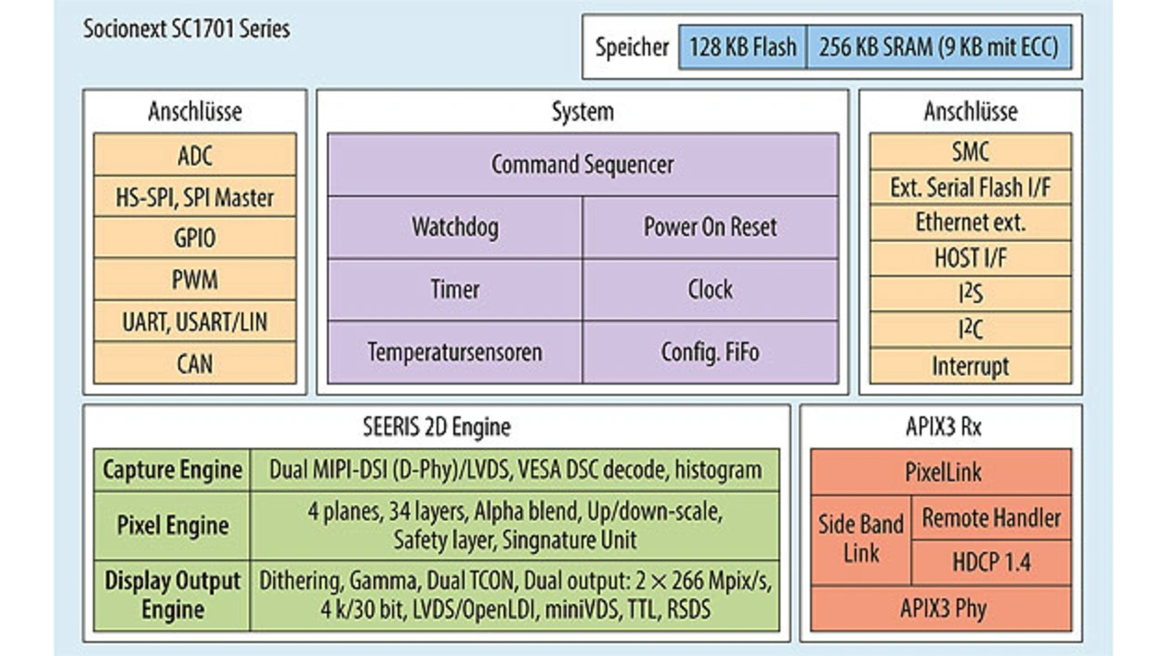 Genauso wichtig ist die Umsetzung des Sicherheitskonzeptes im Display selbst. Speziell für die Sicherheitsanforderungen im Automobilbereich hat Socionext den SC1701 Graphics Display Controller entwickelt. Wegweisend ist dabei die Integration von drei wesentlichen Komponenten: des Kommunikations- und Videolink-Empfängers (APIX 3) mit integrierter Entschlüsselung, der grafischen Verarbeitung und Kontrolle des Videoinhaltes sowie der Ausgabeeinheit zum Display-Panel (Bild 2).