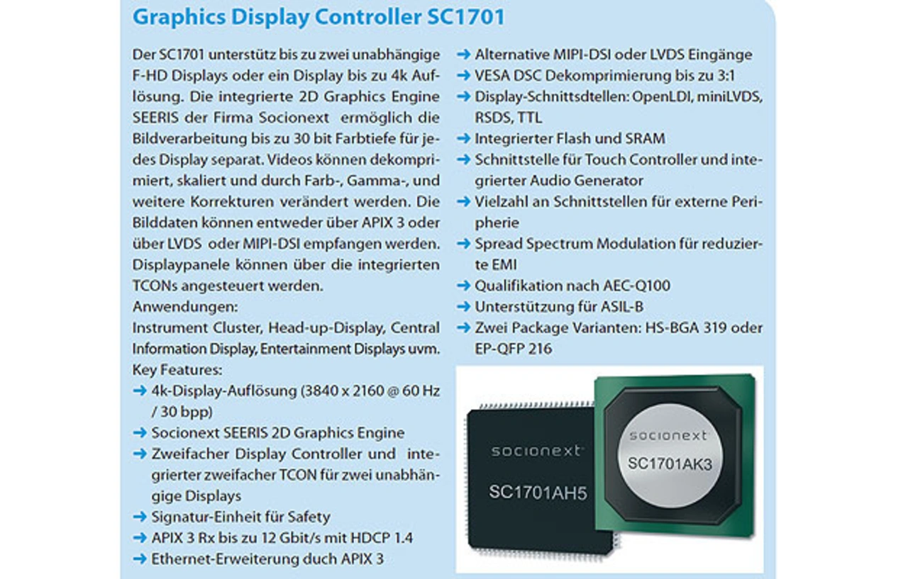 Die Sicherheitskonzepte, die durch den Einsatz des Display Controllers SC1701 von Socionext realisiert werden können, ermöglichen ein Single-Chip-Design, also ein Design ohne wesentliche Zusatzkomponenten. Dadurch ist es möglich, ein Display-System zu entwickeln, das kompakt und flexibel einsetzbar ist und am Ende nach Automotive Safety Integrity Level (ASIL) B zertifiziert werden kann.