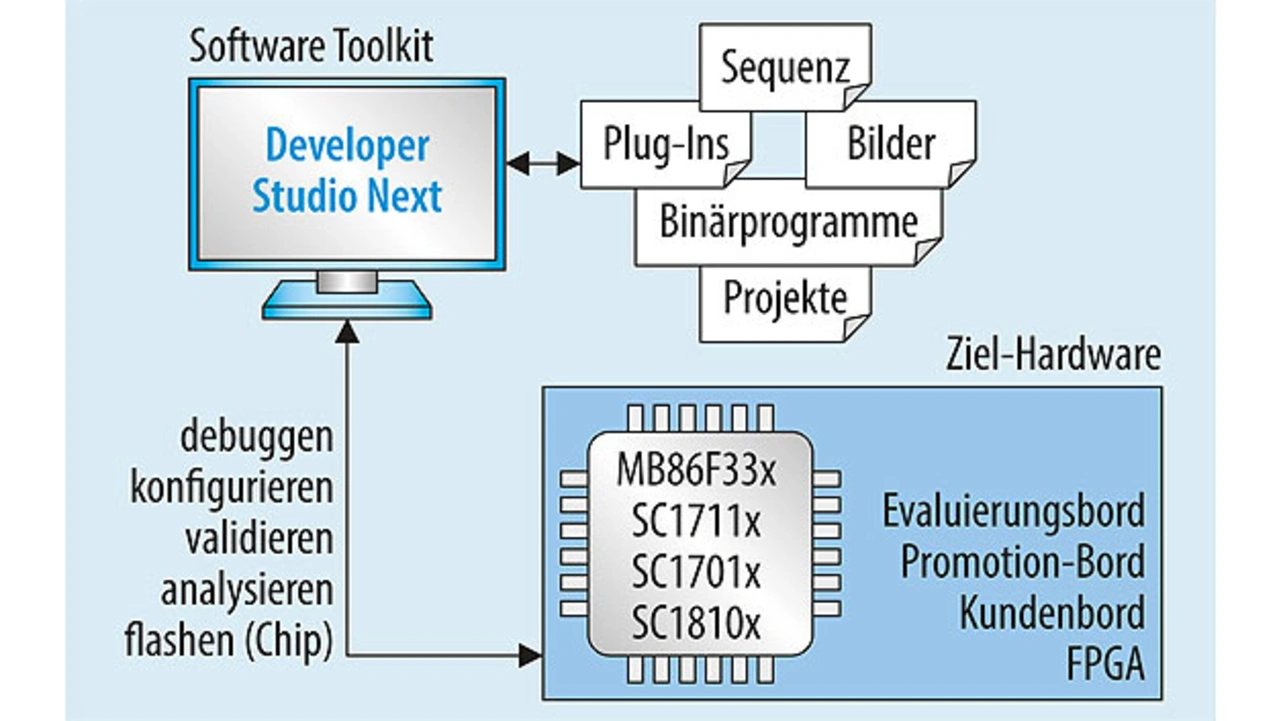 Das Entwerfen einer Remote-Cockpit-Anzeige-Architektur erfordert, dass Software von der Anzeige in die Grafikeinheit migriert wird. Für diese Aufgabe steht eine vollständige Software-Unterstützung zur Verfügung, um sämtliche Anzeigefunktionen und Peripheriegeräte über die APIX-Verbindung zu steuern. Das sogenannte SoC Remote Framework steht für die Entwicklungsphase auf Linux oder Windows PC bereit. Der modulare C-Code ermöglicht eine einfache Portierung auf das eingebettete Zielsystem.