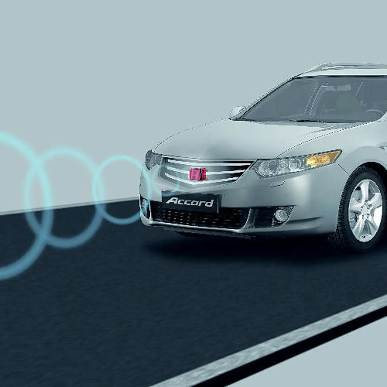 Stufe zwei: Falls der Abstand zwischen den Fahrzeugen weiter abnimmt, bremst CMBS leicht. Der elektronische Gurtstraffer des Fahrers aktiviert einen Elektromotor, der zwei- bis dreimal am Gurt zieht und dem Fahrer eine spürbare Warnung gibt. Der akustische Alarm ertönt und das Warnsymbol erscheint erneut auf dem Display.