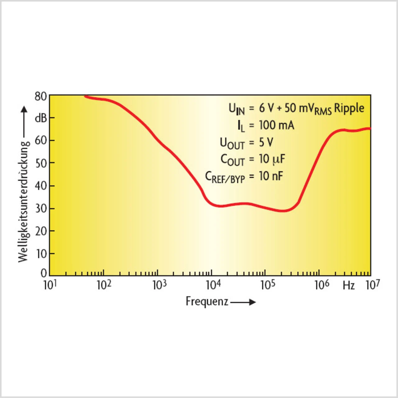 Der Linearregler erzeugt eine stabile und rauscharme Versorgungsspannung für aktive Antennensysteme. Zudem isoliert und schützt er das Antennensystem vor der im Auto üblichen 12-VBordnetzspannung mit derem hohen Störungsaufkommen und Spannungsschwankungen. Das IC hält Eingangsspannungen bis zu ±50 V ebenso wie einer Verpolung der 12-V-Spannung und einer Ausgangsspannungsumkehr (ebenfalls bis zu ±50 V) stand. Einzelheiten sind in Bild 1 dargestellt. Der LT3050 unterdrückt ein Rauschen der Stromversorgung weitestgehend, wodurch die Stromversorgung der Aktivantenne vor einem Rauschen des 12-V-Bordnetzes oder eines zwischengeschalteten Schaltreglers isoliert ist (Bild 2). Hierbei fungiert der Kondensator des Reglers als Bypass für eventuell auftretendes Rauschen und zugleich als Softstart-Referenz, was einen rauscharmen Betrieb als auch eine programmierbare Anlaufzeit ermöglicht.