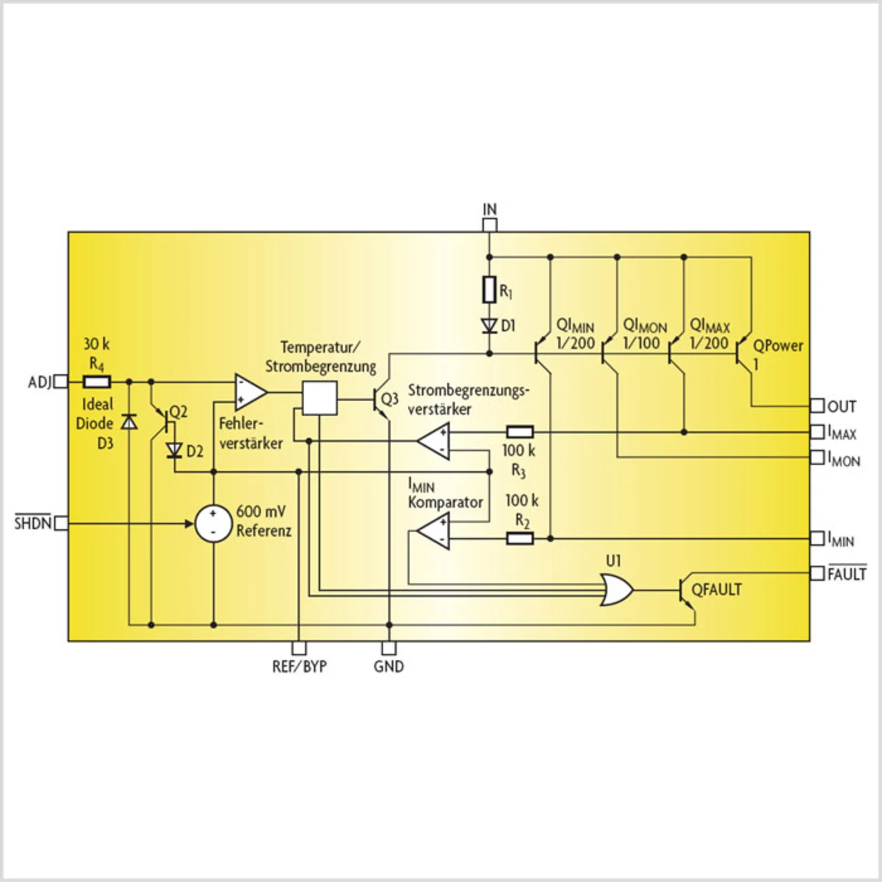 Eine programmierbare Kurzschlusserkennung und Strombegrenzung steht am Pin IMAX zur Verfügung. Einmal eingestellt, variiert dieser Wert um weniger als 5 % gegenüber der Eingangsspannung und Temperatur. Der Pin IMAX fungiert dabei als Kollektor eines speziell konstruierten Stromspiegel-Bausteins, der etwa 1/200 des Ausgangsstroms ausgibt. Gleichzeitig ist dieser Pin als Eingang für den präzisen Strombegrenzungs-Verstärker ausgelegt. Durch das Anbringen eines Widerstand (RIMAX) zwischen IMAX und GND lassen sich die Schwellenwerte für die Kurzschlusserkennung und die programmierbare Strombegrenzung einrichten. Der Strombegrenzungs-Verstärker verrichtet dabei zwei Aufgaben: Erstens stellt er die Logik des Open-Collector-Pins FAULT (Störung) sicher, wenn die Spannung am IMAX-Pin einen Wert von 600 mV erreicht. Zweitens reguliert er den Ausgangstreiberstrom so, dass die Spannung am IMAX-Pin 600 mV nicht überschreitet. Dies begrenzt den Ausgangsstrom auf 0,6 V × 200/RIMAX.